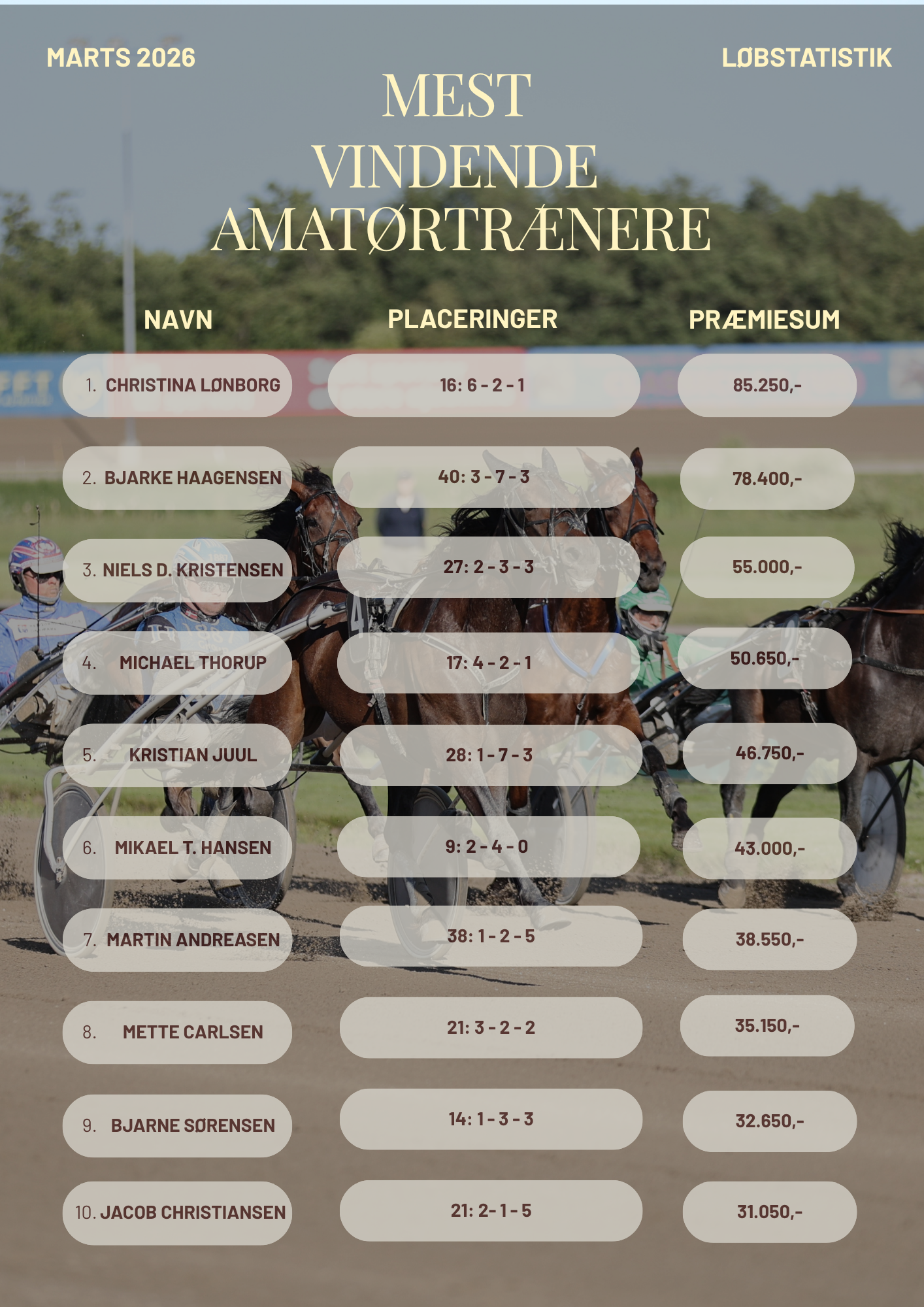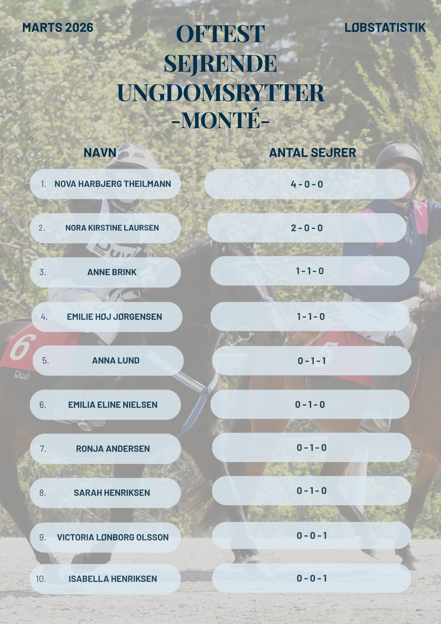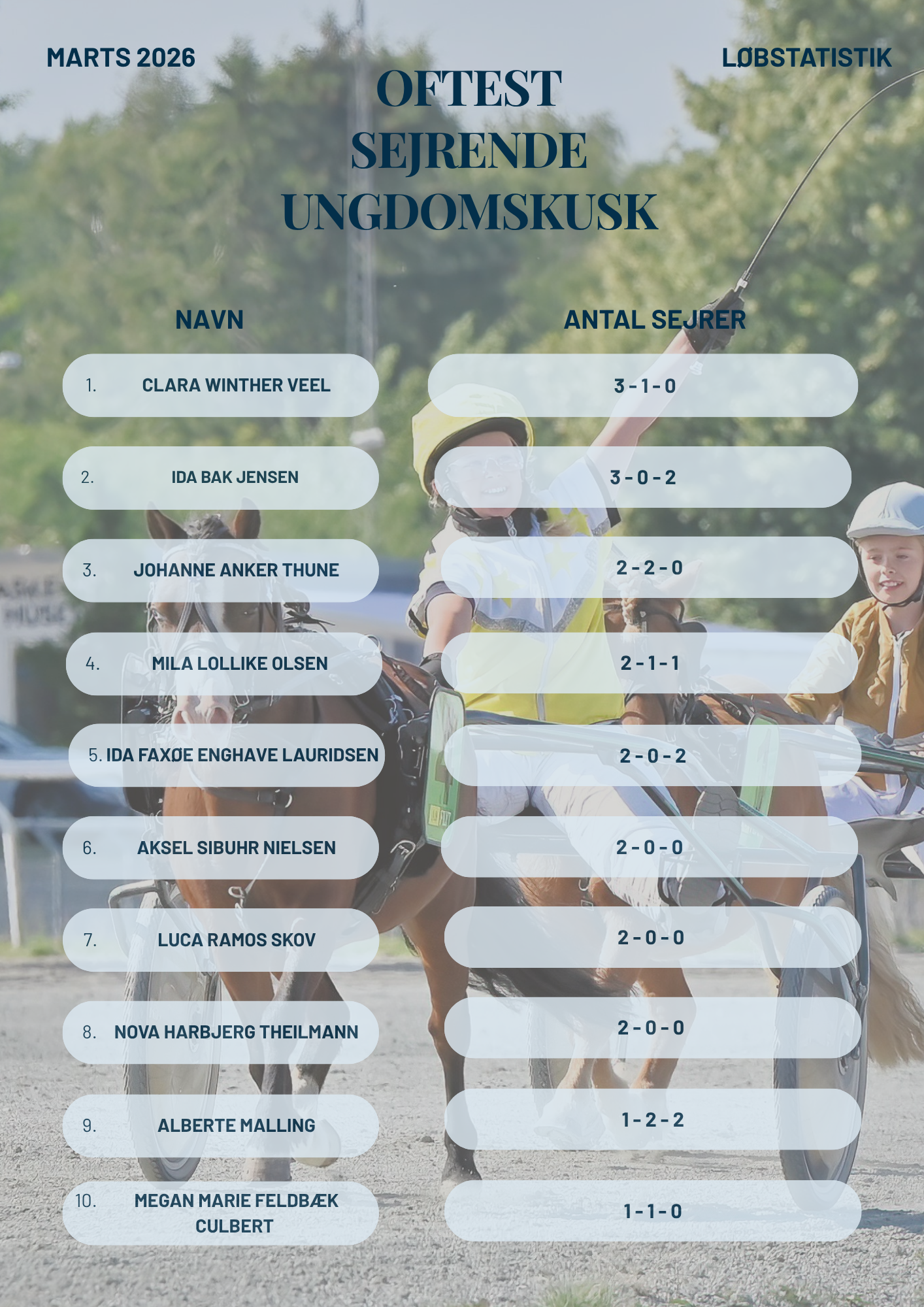 Nyt for marts måned er, at ungdomssporten er kommet med i oversigten. Du finder deres statistikker i galleriet under travsporten.